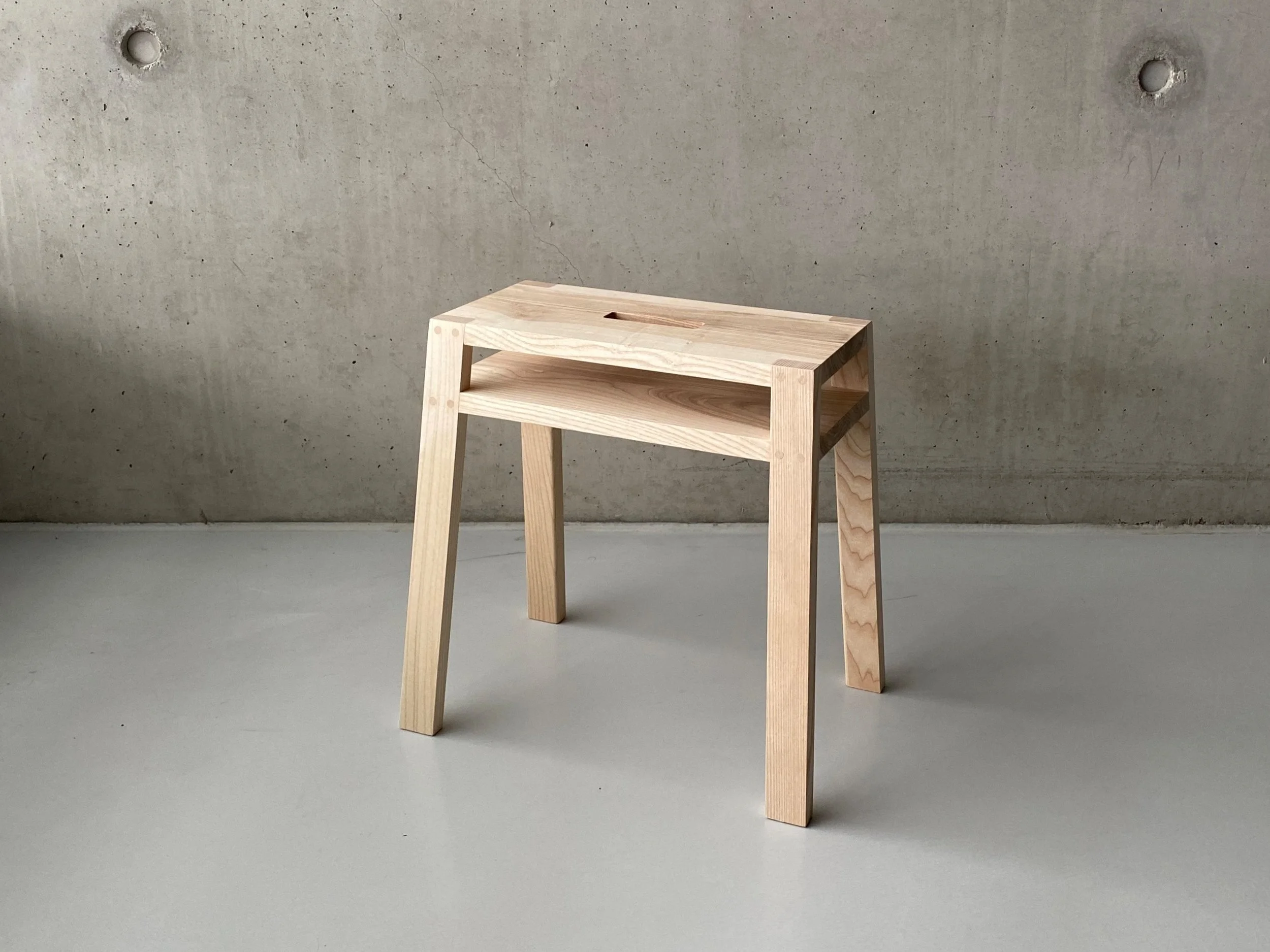 Der Schemel kennzeichnet sich durch seine prägnante, minimalistische Form und seine Funktionalität. Er ist aus Eschenholz gefertigt und wiegt 3000 Gramm.